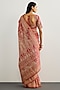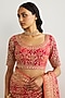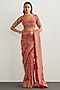 Ri Ritu Kumar presents a fuchsia saree in silk crepe base. It is paired with an unstitched blouse. Accentuate it with statement earrings and heels for a wedding or sangeet ceremony.