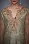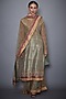 Featuring a khaki green kurta in satin base with gota hand embroidery. It is paired with matching palazzo pants and dupatta.