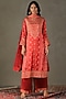 Ri Ritu Kumar features a mesmerizing Lava Red Kurta Set that captivates with its elegance. The eye-catching kurta is crafted in silk satin with a round neckline, full sleeves, geometric print and kashida hand embroidery. It is paired with rayon crepe palazzo pants and a viscose chiffon dupatta. Accentuate this designer kurta set with dangler earrings and heels for a festive occasion or haldi ceremony.