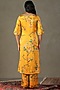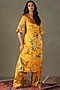 Ri Ritu Kumar presents a mustard yellow kurta in silk satin base with hand and machine embroidery, including floral print. It is paired with pants. Accentuate it with statement jewellery and heels for festive occasions.