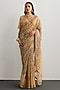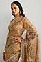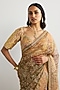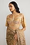 Ri Ritu Kumar features a mesmerizing Peach Saree Set that captivates with its elegance. The eye-catching saree is crafted in silk organza with floral print and aari hand embroidery. It is paired with an embroidered blouse. Accentuate the designer saree set with soft curls, kundan polki jewellery and block heels for a traditional bridal look. Perfect wear for a wedding or sangeet ceremony.