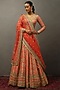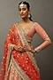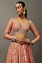 Ri Ritu Kumar presents a coral pink lehenga in silk dupion base with aari and zardosi hand embroidery, including floral and paisley print. It is paired with a blouse and a net dupatta. Accentuate it with statement jewellery and heels for weddings or a bridal look.