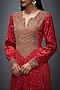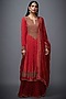 Featuring a red and golden kurta in silk and satin base with bandhani bhopali zardosi embroidery and floral print. It is paired with a matching crinkled skirt and a dupatta.