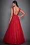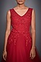 Featuring a red sleeveless gown in rayon crepe base. It has hand and machine embroidery.