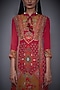 Featuring a red and olive green kurta in viscose crepe base with hand and machine embroidery. It is paired with matching churidar pants and a dupatta.
