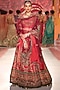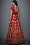 Featuring a red and saffron lehenga in silk and satin base with floral embroidery. It is paired with a matching blouse and a dupatta.