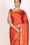 Featuring a red and saffron saree in silk and satin base with aari embroidery. It is paired with a matching unstitched blouse.