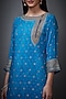 Featuring a royal blue layered kurta in silk crepe base with zari hand embroidery. It is paired with a matching inner, churidar pants, and a dupatta.