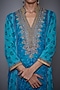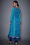 Featuring a royal blue and turquoise kurta in viscose and georgette base with zardosi hand embroidery. It is paired with matching churidar pants and a dupatta.