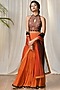 Featuring a rust orange and black blouse in rayon crepe base with aari and tikki hand embroidery. It is paired with a matching lehenga and a dupatta.