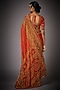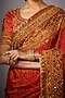Featuring a rust orange saree in viscose chiffon base with geometric and floral embroidery. It is paired with a matching unstitched blouse.