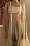 Ri Ritu Kumar features a mesmerizing Slate Green Gharara Set that captivates with its elegance. The eye-catching sleeveless cape is crafted in polyester with a square neckline, machine and hand embroidery. It is paired with a silk bustier and gharara pants. Accentuate this designer gharara set with statement earrings and heels for a sangeet ceremony or cocktail party.