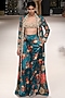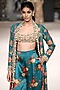 Featuring a teal blue jacket in silk satin base with floral print and embroidery. It is paired with a bustier and palazzo pants. Style it with stud earrings and heels for festive occasions.