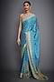 Featuring a turquoise and gold saree in silk satin base with aari and tikki hand embroidery. It is paired with a matching unstiched blouse.