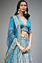 Featuring a turquoise lehenga in silk base with floral tropical print and aari hand embroidery. It is paired with a matching blouse and a polyester dupatta.