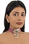 Featuring a gold finish choker necklace studded with pink jadau, moissanite stones, pearls and glass beads, set in silver. It is paired with a matching pair of earrings.