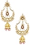 Featuring a pair of gold finish crescent earrings studded with white and pink jadtar stones with gold pearl bunches drops, copper and silver mix.