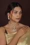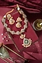 Featuring a 22kt gold plated necklace studded with green jadtar stones and pearls, set in silver and copper mix. It is paired with a matching pair of earrings. Perfect for festive occasions, weddings or cultural events, this jewellery is a wardrobe must for those who love to shine effortlessly.