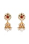 Featuring a pair of 22 kt matte gold plated jhumka earrings studded with navratna stones, pearls and glass beads, set in silver and copper mix. Ideal for festive occasions or a wedding ceremony.