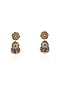 Featuring a pair of 22 kt gold plated dangler earrings studded with real jadtar stones, semi-precious stone, pearls and glass beads, set in silver and copper mix. Perfect wear for festive occasions or wedding ceremonies.