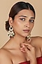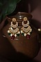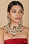 Featuring a 22kt gold plated necklace studded with emerald green jadtar beads and pearls, set in silver and copper mix. It is paired with a matching pair of earrings. Perfect for festive occasions, weddings or cultural events, this jewellery is a wardrobe must for those who love to shine effortlessly.