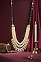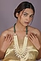 Featuring a 22kt gold plated layered mala studded with pearls, jadtar stones and emerald green onyx beads, set in silver and copper mix. Perfect for festive occasions, weddings or cultural events, this jewellery is a wardrobe must for those who love to shine effortlessly.