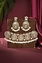Featuring a 22kt gold plated choker necklace studded with jadtar stones, pastel pink beads and pearls, set in silver and copper mix. It is paired with a matching pair of earrings. Perfect for festive occasions, weddings or cultural events, this jewellery is a wardrobe must for those who love to shine effortlessly.