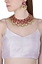 Featuring a gold plated choker necklace embedded with pink semi-precious stones. It comes along with matching paan shaped earrings, copper and silver mix.