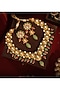 Featuring a 22 kt matte gold plated blue meenakari necklace studded with pink and mint green stones, set in mixed metal. It is paired with a matching pair of earrings. Ideal for festive occasions, weddings, or elevating your elegant evening look.