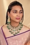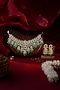 Featuring a 22 kt matte gold plated necklace studded with white jadtar stones and emerald drops, set in mixed metal. It is paired with a matching pair of earrings. Ideal for festive occasions, weddings, or elevating your elegant evening look.