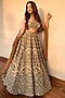 Featuring an olive green lehenga in raw silk and tulle base with cutdana, sequins, and floral motif embroidery. It is paired with a matching blouse and a sheer dupatta.