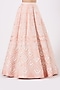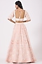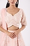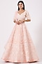Featuring a pastel peach lehenga in silk taffeta base with pearl, shells, and glass bead embroidery. It is paired with a matching embroidered blouse and a net dupatta.