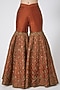 Featuring a rust red kurta in raw silk base with cutdana and jaal embroidery. It is paired with matching gharara pants and a navy blue dupatta in silk velvet base.