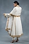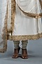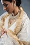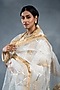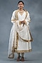 Featuring an ivory kurta in chanderi and silk organza base with gota stripe embellishment and gold fringe work. It is paired with cotton silk churidar pants and an organza dupatta. Accentuate it with statement earrings and block heels for festive occasions.
