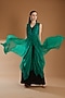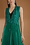 Featuring an emerald green jacket in organza, modal satin and taffeta base with sequins embroidery. It is paired with a contrasting black jumpsuit.