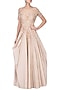 Featuring a gold gown in tafta base with floral motif hand embroidery on the bodice and sheer neckline detailing along with structured drape on the ghera.