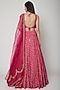 Featuring a berry pink blouse in chanderi base with paisley print and scallop neckline. It is paired with matching lehenga and organza embroidered dupatta.