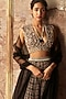 Featuring a black skirt in chiffon and net base with multi ikat print and embroidery. It is paired with a matching blouse, a belt and organza dupatta.