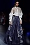 This set features a black asymmetric drape skirt in silk base with ivory floral tribal print. It is paired with an ivory collared shirt in silk and handmade mesh finished with feather detailing and knotted sleeves hem along ivory bustier.