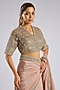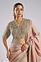 Featuring a dusky pink saree in silk base with embroidery. It is paired with a net and kota tissue embroidered blouse and a crepe underskirt. Accentuate it the designer set with zircon jewellery, embellished heels and a potli bag for a complete look, Perfect wear for engagement or sangeet ceremony.