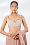 Featuring a dusky rose draped saree in chiffon base with organza ruffles. It is paired with a raw silk embroidered blouse. Accentuate it with statement jewellery and heels for festive occasions or wedding ceremony.