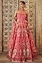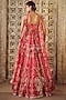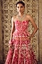 Featuring a fuchsia lehenga in organza base with print and embroidery. It is paired with an embroidered corset and a printed dupatta having ruffle detail. Accentuate it with statement jewellery and heels for a wedding, engagement or sangeet ceremony.