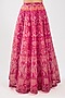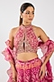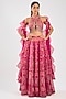 Featuring a fuchsia lehenga in organza base with print. It is paired with an embroidered and printed blouse, including a net printed dupatta. Accentuate the designer lehenga with diamond or rose gold jewellery, embellished heels and a potli bag, perfect for a bridal look, sangeet or a wedding ceremony.