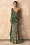 Featuring a green skirt saree in chiffon base with print and an attached net drape . It is paired with a net and organza embroidered blouse. Style it with statement earrings, bold heels and a metallic clutch for a striking edge, Perfect for a wedding, mehendi, engagement parties, or glamorous evening celebrations.
