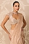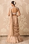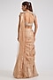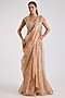 Featuring a gunmetal gold draped skirt saree in tissue base. It is paired with a net and tissue embroidered blouse. Style it with statement earrings, bold heels and a metallic clutch for a striking edge, Perfect for a wedding, mehendi, engagement parties, or glamorous evening celebrations.
