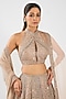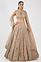 Featuring a gunmetal lehenga in tissue base with embroidery. It is paired with a tissue embroidered blouse and a net embroidered dupatta. Accentuate it with kundan polki or zircon jewellery, embellished heels and a potli bag for a wedding, engagement or sangeet ceremony.