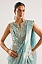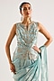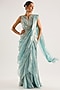 Featuring an ice gold draped ruffled saree in tissue base. It is paired with an embroidered top. Accentuate it with zircon jewellery and embellished heels for a sangeet or wedding ceremony.
