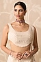 Featuring an ivory pre-stitched draped saree in chiffon base. It is paired with a net embroidered blouse. Style it with statement earrings, bold heels and a metallic clutch for a striking edge, Perfect for cocktail soirees, engagement parties, or glamorous evening celebrations.
