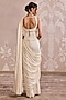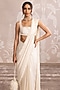 Featuring an ivory saree in fine silk base with embroidery. It is paired with a jacquard sleeveless blouse having placement embroidery and a crepe underskirt. Accentuate it with statement earrings, sleek heels, and a clutch for an elegant look, perfect for receptions, festive gatherings, or cocktail parties.