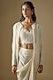 Featuring an ivory jacket in georgette base with embroidery. It is paired with a net embroidered bustier and a draped skirt. Accentuate it with dangler earrings and heels for a festive occasion, cocktail or sangeet ceremony.